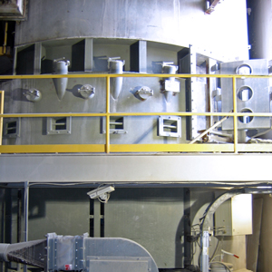 Le préchauffeur multicyclone avec calcinateur allongé, situé en amont du four rotatif, est un équipement qui permet un transfert de chaleur hautement efficace entre les gaz chauds ascendants et le cru descendant. Il a pour but de calciner et d’élever la température du cru jusqu’à 900°C avant son entrée au four. Par une série de cyclones, le préchauffeur avec calcinateur allongé optimise l’échange des gaz chauds avec le cru. En plus, il récupère l’énergie de l’écofournaise, du four rotatif et du refroidisseur à clinker pour une efficacité énergétique optimale. CQI est la seule cimenterie au Québec à posséder cette installation qui maximise la combustion et réduit la consommation d’énergie combustible.
